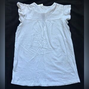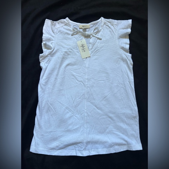 Elegant knit top with ruffle detail. Features a delicate bow accent.