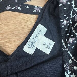 Style & Co Woman boho tunic top in size 1X. Black floral/geo print with a flowy, relaxed fit. Features a criss-cross back keyhole detail, adding a subtle feminine touch. Lightweight nylon fabric with a tiered, ruffle-style hem and long sleeves. No major flaws.