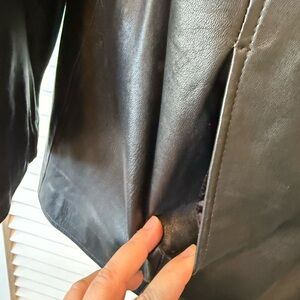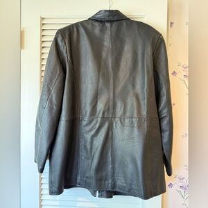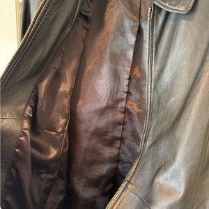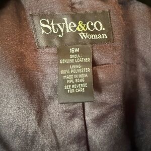 Style & Co genuine black leather jacket. Fully polyester lined. Side pockets that are also lined. Collar. Zip up. Longer fit. 16W. Hardly worn. Great condition.