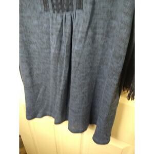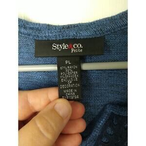 Style &Co blue heathered 3/4 sleeve fringe crocheted trim lightweight sweater in good condition. V neckline pintucks front
