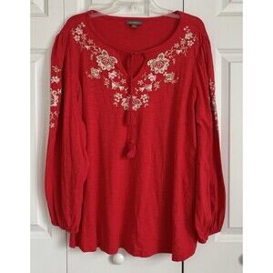 Style & Co. Women's Top Red Embroidered Long Sleeve with elastic cuffs Pullon Tassel Tie Blouse Boho