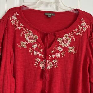 Style & Co. Women s Red Embroidered Long Sleeve Pullon Tassel Tie Blouse Boho
