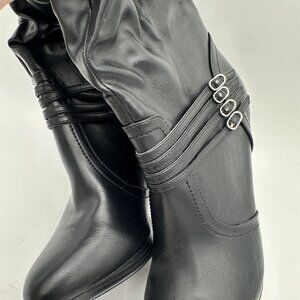 These knee-high boots by Style & Co are crafted for the modern woman who values both style and comfort. Featuring a sleek black design, these boots are enhanced with elegant buckle detailing and a high heel, offering a sophisticated touch to any outfit.