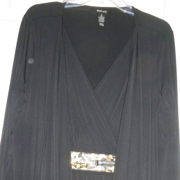 Style & Co- Women’s vintage black pull-over top with leopard print faux belt, gold tone chain. Size: 1X. Drapery stretch fabric, ¾ length sleeves, open front attached jacket. Gathered in back. Material: 95% polyester, 5% spandex.