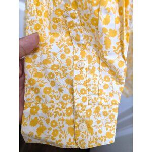 This cotton button-down shirt features a cheerful yellow and white floral print throughout. The classic collar, full button front, and long sleeves create a polished silhouette suitable for both professional and casual settings.
