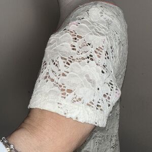 This Style & Co. women's shirt top is an ivory crocheted lace open knit classic top in size small. The scoop neck and short sleeves add a touch of elegance to the blouse, while the lightweight and breathable fabric make it perfect for any occasion. The top features a solid pattern and a fitted sleeve type, with accents of crocheted lace for a fun and unique touch.