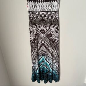 Stretchy jersey material. Slit V neck. Paisley print. Maxi. Brown and blue tones