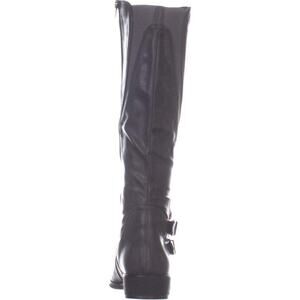 These almond-toe riding boots feature a full zipper closure at the inner ankle for easy on and off, complemented by stylish buckled strap details at the ankle. Designed for comfort, they include a padded sock and have a 1-1/4 inch heel. Please note that the shaft height and circumference may vary by size, while the elastic gore at the top back and sides ensures a snug fit.