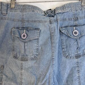 Stretchy waistband, front button/zip, lots of front pockets, back button pockets, long inseam, bermuda, lightweight denim