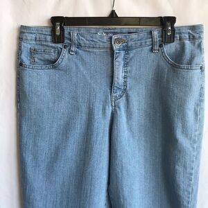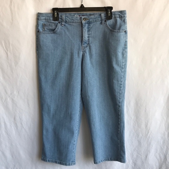 Style & Co. blue denim capris, size 12. Good preowned condition; slight thread pull on wearer’s right pant leg (see photo).