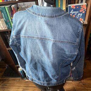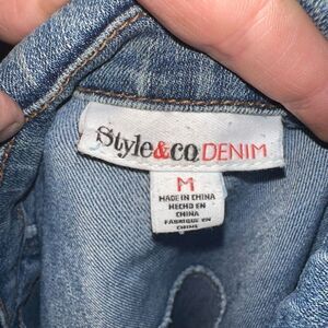 Style & Co distressed, normcore, elevated basics, versatile denim jacket with coppery buttons. In good, used condition. Pairs well with pants and a basic tee or over a dress. Approximately 22 inches from armpit to armpit, 21 inches long. From a pet and smoke free house.