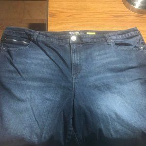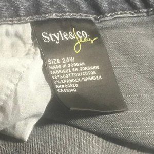 These Style & Co slim leg denim jeans are women's size 24W. They have a button and zip front fly and 5 pockets. The front coin pocket has a zipper closure. There are also 5.5" zippers at the ankles. These jeans have a lot of stretch, they are 98% cotton and 2% spandex. These jeans are in excellent used condition. Approximate measurements (laying flat, unstretched) are: