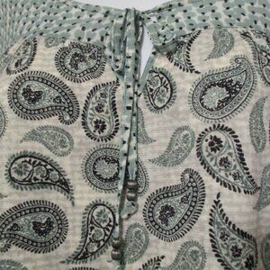 Style & Co brand - Romantic Boho babydoll type top. Flowy, lightweight feminine top that has stretch. 3/4 length flare sleeves. Front neckline ties. Notice material ruffle around the waist area of the top. See close up for beautiful colors of sage greens, black and off white. Like new condition