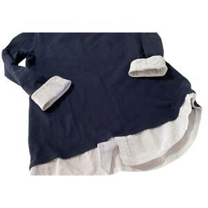 Navy long sleeve t-shirt with roll up sleeves that peek white and attached white bottom hem that looks like it’s a blouse beneath. Size S, 18.5” X 24”