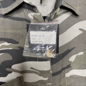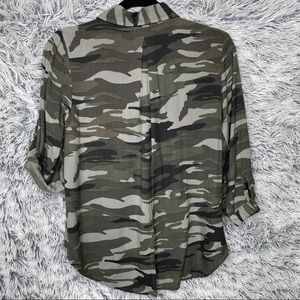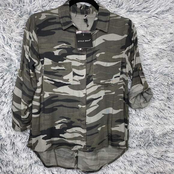 Style Envy camo button up blouse NWT. Optional roll up button sleeves, slit back, with 2 front pockets. One side of tag came off. Women’s Small.