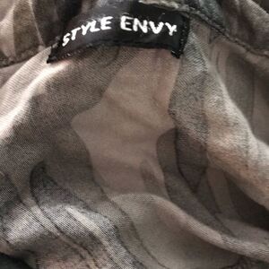 Style Envy camouflage button-up blouse with a hi-low hem, suitable for casual wear. It features long sleeves.