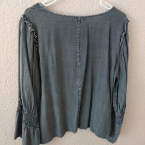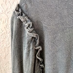 gray thin top with ruffles along the shoulder and then synched wrists on the sleeves. Very soft and comfortable to wear