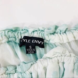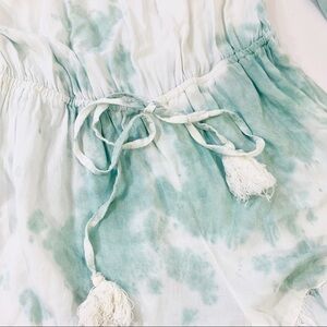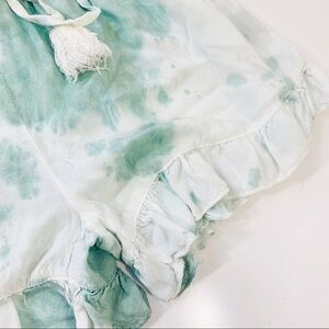 Long sleeve off the shoulder romper with elastic waist and tassel waist ties. Ruffle at hem of shorts.