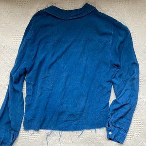 features two chest pockets, functional buttons at front & cuffs, and a raw hem. marked as size M, but best fits XS-S.