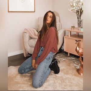 Lulus Exclusive! Rain or shine, the Lulus Style Forecast Rust Red Ribbed Sweater Top has you covered! Lightweight but cozy ribbed knit, with stripes of fuzzy knit throughout, shapes this cute sweater top that has a V-neckline, long sleeves with drop shoulders and fitted cuffs, and a wide-cut, slightly cropped bodice. Pair with your favorite ankle booties and dark wash jeans for a look that will set the trend!
