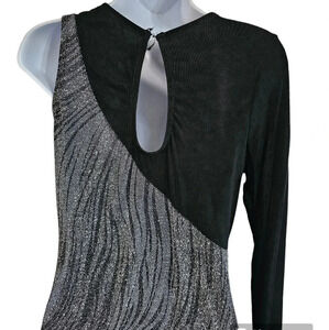 Features: Sparkly metallic fabric, asymmetrical one-sleeve design, diagonal silver stripe, mid-length hem