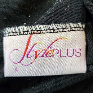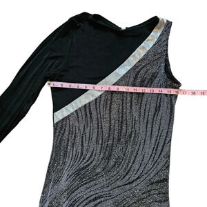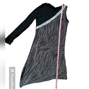 Shine under the lights in this vintage 90s Style Plus performance dress, women’s size Large. Featuring an eye-catching silver and black glitter swirl pattern with an asymmetrical design — one side sleeveless, the other with a full black sleeve — and a diagonal silver stripe accent. Perfect for stage performances, dance competitions, or themed parties.