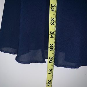 Upper floral and lower solid navy dress. Lined with elastic at the waste. Swoop neck and sleeveless. Lining is 35 in. Chiffon is 36 in. New with tags.