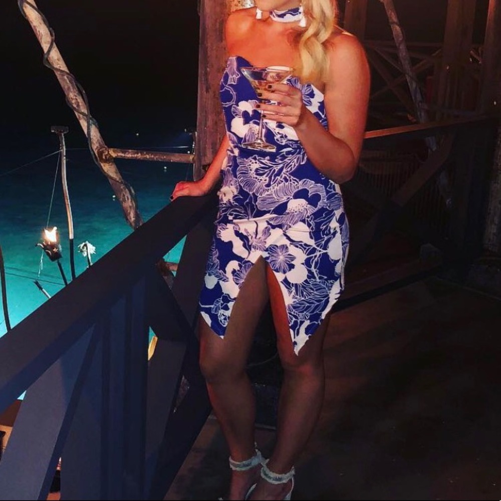 Great condition, only worn once. Perfect for Miami, island vibes but make it sexy. Strapless, but goes around neck to hold the dress up to keep everything in place.
