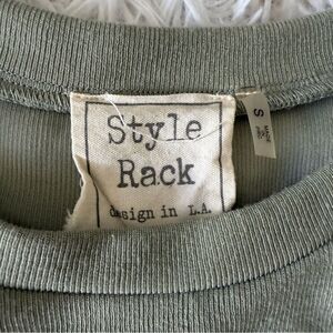 This midi dress is such a perfect all-weather basic! Throw on a suede jacket or sweater duster in the colder months, or wear solo in the warmer months. From the brand Style Rack and purchased at a boutique in Miami, features include a sleeveless top, crew neckline, bodycon stretch fit, midi length that can be shorted with the ties on each side, flattering ruching at the sides, slip on design and ribbed sage green fabric. Excellent condition!