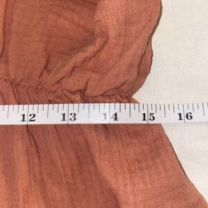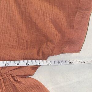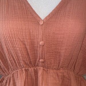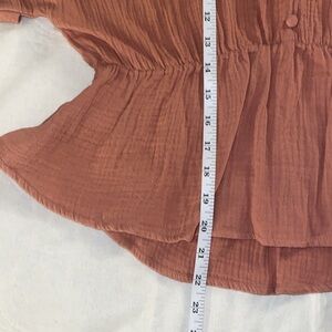 V-neck with 3 faux buttons at bust, drop sleeves with cuffed edge detail. Open back detail to waist with single button closure at top and tie string at mid back. Fully elasticized waist, peplum ruffle bottom. Gauze-like 100% cotton fabric.