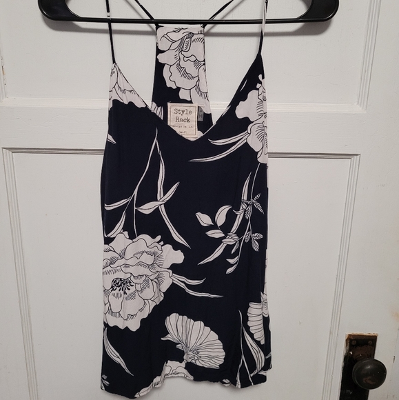 Size Small navy w/white flower racerback top. Purchased from Cookies Clothing Co.