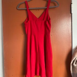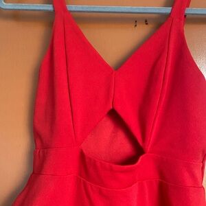 This vibrant red dress features a V neckline and a sleeveless design, perfect for a night out. Triangular cut out in the upper abdominal region. Stretchy and comfy while still cute and sleek!