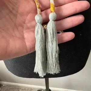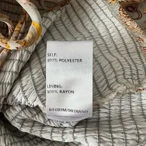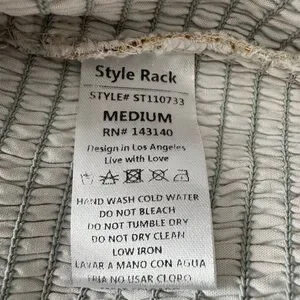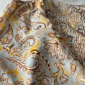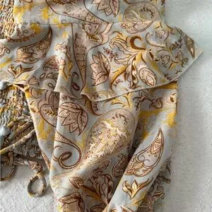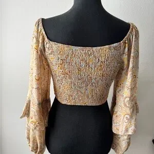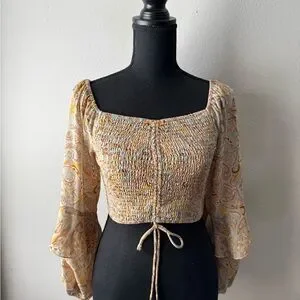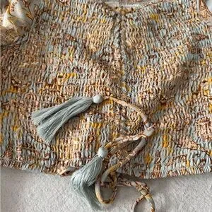 Style Rack blue paisley ruched top. Lovely feminine pattern and colors. Can be worn on or off shoulders. Ruched portion has a long tie down the front middle with a soft blue gray tassel on each end. It can be drawn up; they are functional. The sleeve is 3/4 length with elastic at the end and is soft and flowy. Midway down the sleeve is an extra piece adding to the softness and flow. It gives it an extra feminine touch! Back is square across the top. Originally $54. Size M. Excellent condition. Non smoking home. Would look lovely dressed up or down with denim or a skirt!