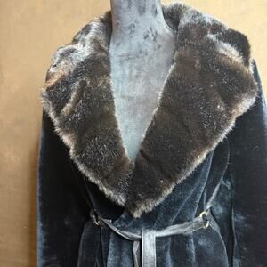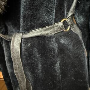 Materials: Faux fur body, fur collar (no content tag, appears real hair), leather belt