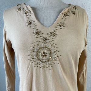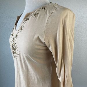 Super cute and casual v-neck by Style & Co. featuring a beaded design along the collar and front. It measures 18 inches armpit to armpit laying flat and is 25 inches in length from shoulder to hem.