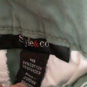 Style and Co, size 10. Good amount of stretch with 98% cotton and 2% spandex. 12" inseam (knee length). Light olive green color.