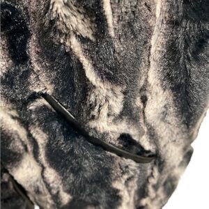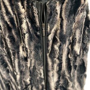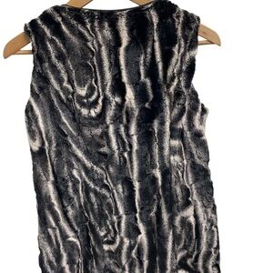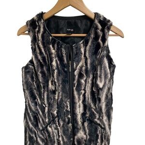 Faux fur vest with faux leather trim with pockets. Armpit to armpit 18” across, length 23”. Excellent preowned condition.