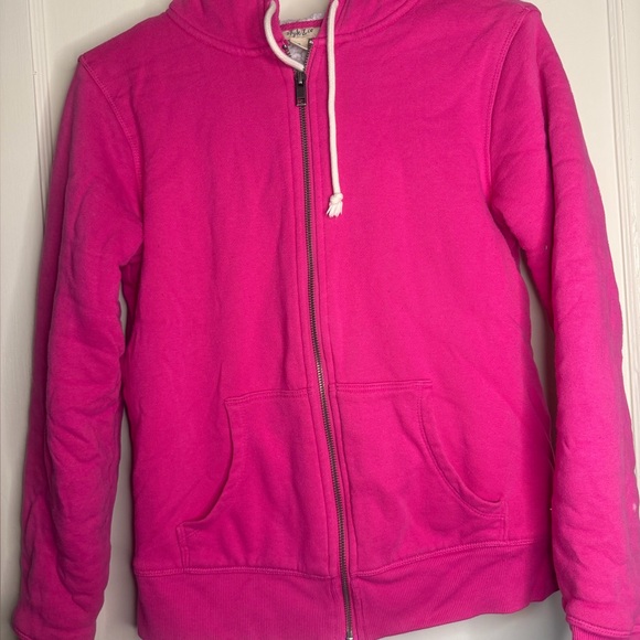 Vibrant pink hoodie with a zip-up front and pockets. Features a drawstring hood.