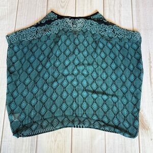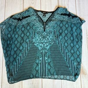 Chic teal blouse with intricate black patterns. Perfect for versatile styling.
