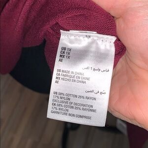 Brand new with tags! This long sleeved maroon sweater has a fashion-forward fringe neckline! The fringe is a pointelle knit and hangs on a cowl-neck drape collar. Lightweight sweater. Size 1x.