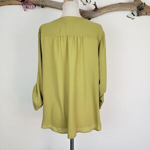 Beautiful chartreuse top with tab sleeves and pleated bib front