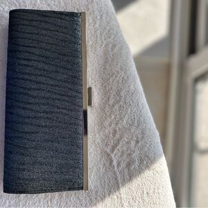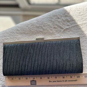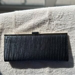 Metallic sheen, black/charcoal clutch with a sleek silver-tone metal frame. Faux leather exterior with a textured embossed crocodile or snakeskin pattern. Perfect for evening events.