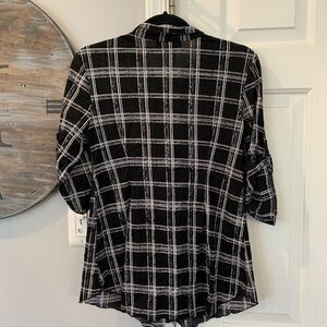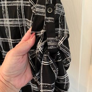 199% nylon. Flattering cut and flair. Roll up sleeve buttons. Measures 16.5” across the bust and 25” long