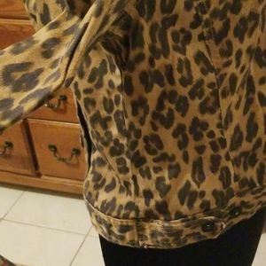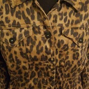 Beautiful animal print Denim jacket, has pockets on front and side. Arm length 24in, bust is 20in wide, length from shoulder to bottom of jacket is 22in long. In great condition (D)