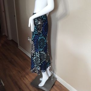 Beautiful sunflower burst in shades of blue and beige over black, rippled hem line.shell overlays a black attached lining. Pull on elastic waist. #style&,co #skirt (B-1)