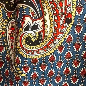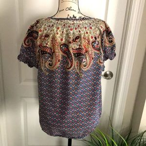 Style&Co. boho paisley top with tie neck and puffed sleeves. Hemline is elasticized. Blue, rust, cream, and yellow.