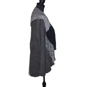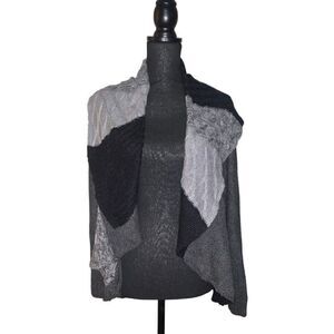 Gray and black patchwork open front cardigan. Long sleeve. 100% acrylic. Size: small. Preowned in good condition.