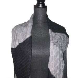 Gray and black patchwork open front cardigan. Long sleeve. 100% acrylic. Size: small. Preowned in good condition.