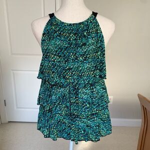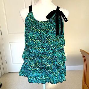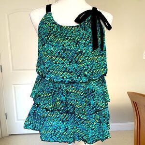 Style&Co. ruffle tiered top with tie at shoulder. Pretty blue and green pattern. Excellent condition with no flaws.