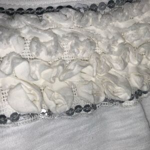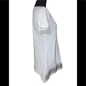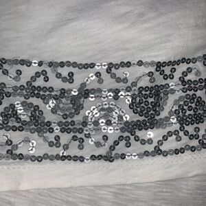 White petite tunic crop. Rose design around front collar outlined by sequin. Crewneck. Sequin design at hem. Short sleeve. 100% cotton. Size: small. Preowned in good condition.